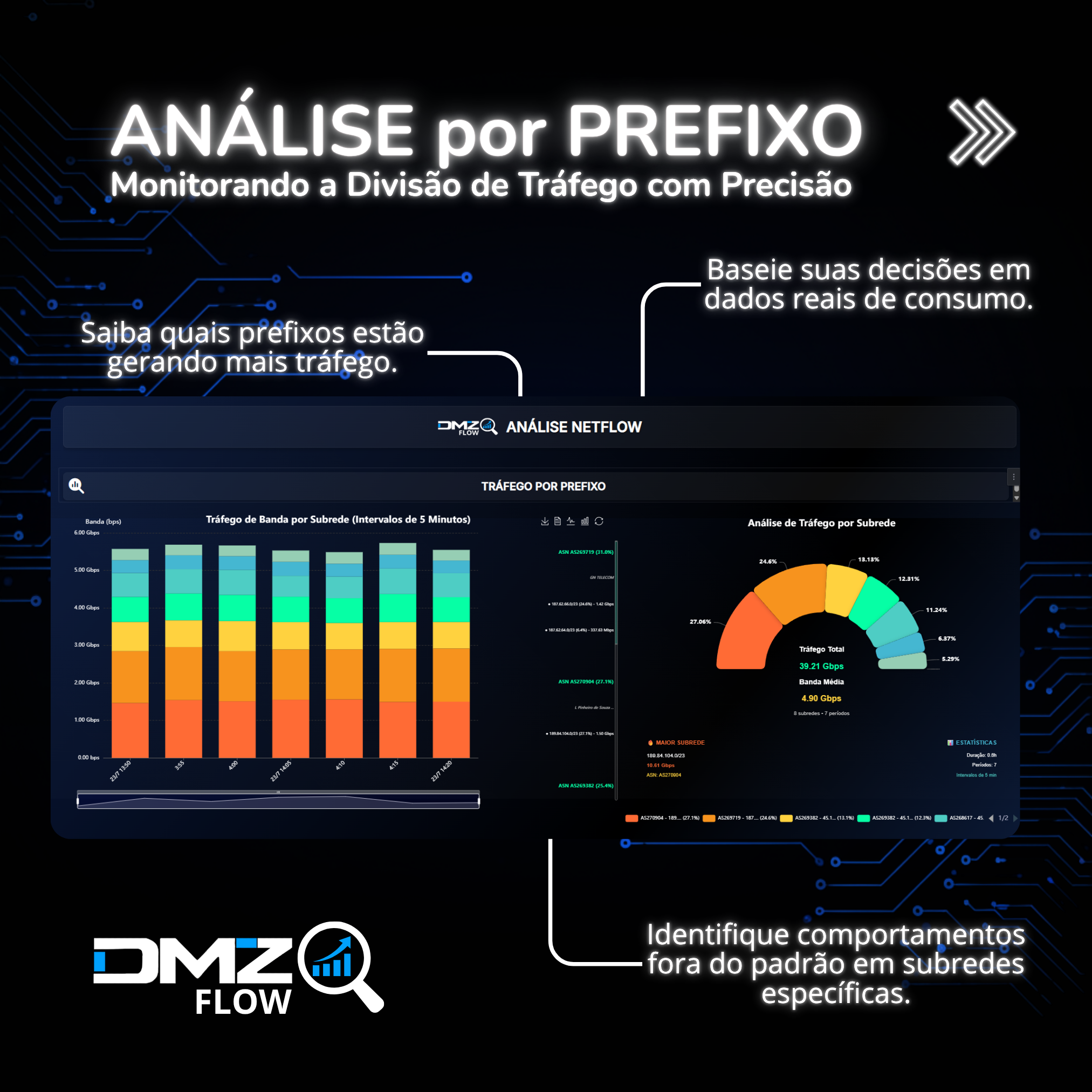 O DMZ Flow oferece uma visão completa do tráfego da sua rede, permitindo identificar gargalos, analisar comportamentos e planejar a capacidade de forma inteligente.